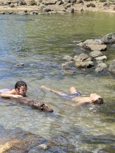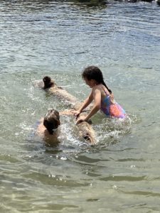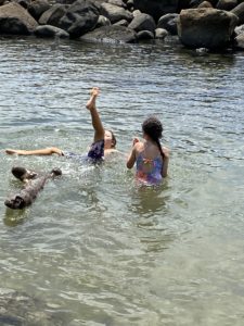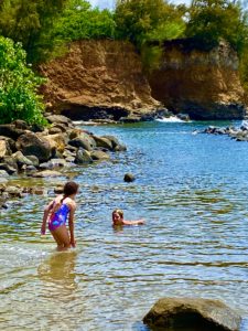 There is as you can see some sand. Just enough for the kids to have a great time safely in a small protected area. Surfers will sometimes surf there it can get rough and has a rocky bottom. It is a nice and scenic place however.