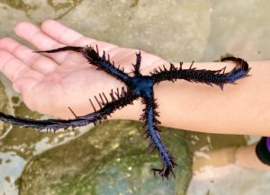 Brittle star, also called serpent star, any of the 2,100 living species of marine invertebrates constituting the subclass Ophiuroidea (phylum Echinodermata). Their long, thin arms—usually five and often forked and spiny—are distinctly set off from the small disk-shaped body. The arms readily break off but soon regrow. Among the basket stars, a type of brittle star, each arm may branch multiple times, and the outstretched arms reach nearly 3 feet across. Most basket stars live in deep water. These Brittle stars were found in 1 – 3 feet of water by turning over rocks.